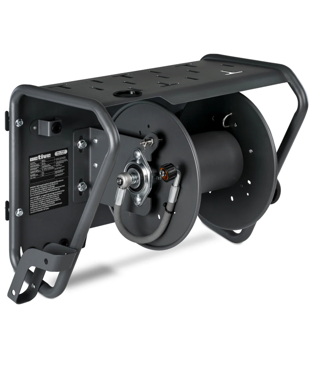 This package includes a hose reel capable of storing up to 30m of 3/8' hose and 45m of 5/16' hose, a wall mount cage with dedicated slots for pressure washer gun, foam cannon, lance and 4 nozzles. A 16” backing plate for safe mounting on the wall and a 5/16” diameter jumper hose with an M22-14mm connector for installation with the pressure washer.