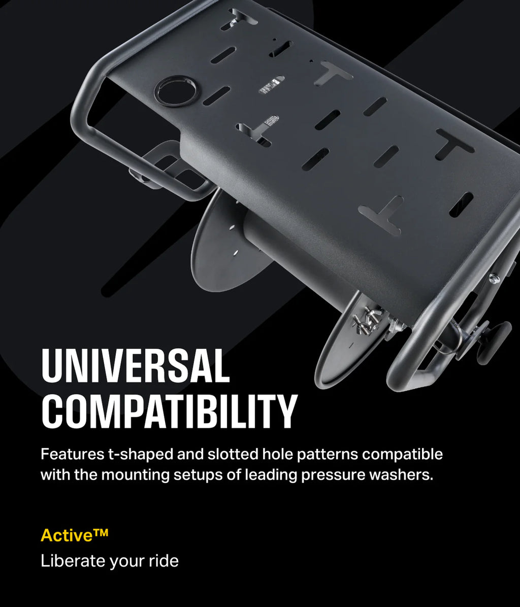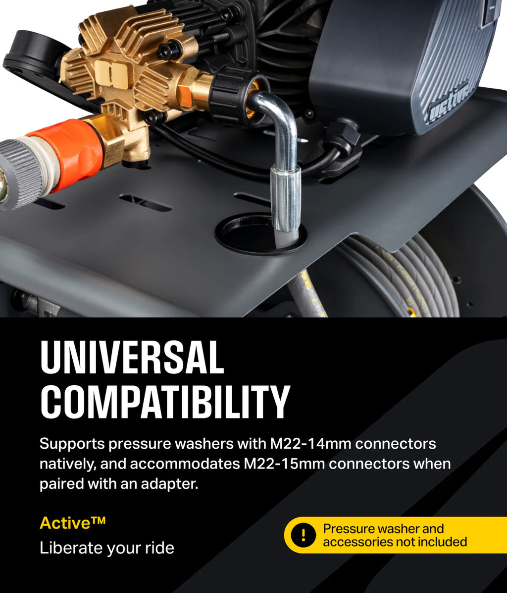 This kit has been built for optimized use with the Active 2.0 and 2.3 pressure washer and accessories. But it can be used to store any pressure washer with M22-14mm outlets. If you wish to use an M22-15mm pressure washer, you will need to source a separate jumper hose. Furthermore, any accessory terminating in a ¼” male plug (foam cannon, lance and nozzle can be used to store in the accessory mounts.